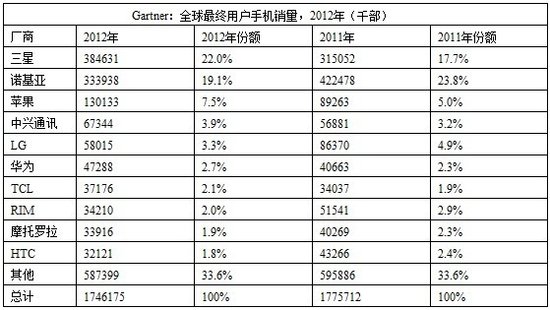 么樣子?我們可以首先從手機(jī)的種類(lèi)上分析一下。根據(jù)2012年的手機(jī)銷(xiāo)量報(bào)告顯示,目前全球手機(jī)銷(xiāo)量前三的分別是三星,諾基亞,蘋(píng)果。而三星的操作系統(tǒng)本身就是由谷歌所授權(quán)的Android,而蘋(píng)果所使用的就是其IOS系統(tǒng),這其中唯有諾基亞使用的是Symbian系統(tǒng)。但是別忘了,Symbian系統(tǒng)本來(lái)也不是我們自主研發(fā)的系統(tǒng)。我們?cè)倏纯催@份2011年和2012年出貨榜單上的前十名,