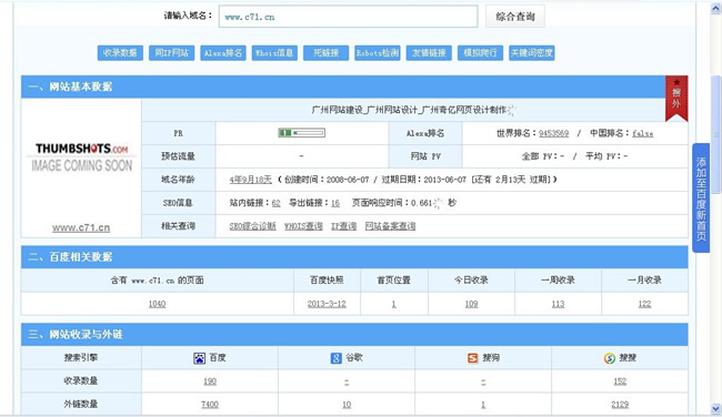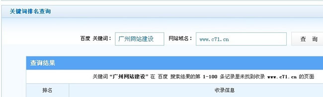 相信很多站長都會遇到這樣的問題,明明沒有做什么動作,甚至包括文章發(fā)布、外鏈建設(shè)等,網(wǎng)站的排名卻突然間沒有了。但是使用站長工具查看各種網(wǎng)站指標(biāo),卻絲毫沒有被K或者是降權(quán)的跡象。筆者的一個網(wǎng)站www.c71.cn也是,平時都是幾天發(fā)一篇文章,每天做等數(shù)量的外鏈,由于內(nèi)部優(yōu)化做得比較好,排名一直在穩(wěn)步上升趨勢,早上用手機查看的時候關(guān)鍵詞“廣州網(wǎng)站建設(shè)”排名還在百度第三頁,但是回到公司用電腦查詢之后卻發(fā)現(xiàn)排名沒有了!但是查詢其他關(guān)鍵詞的排名,還是穩(wěn)穩(wěn)的(如下圖所示)