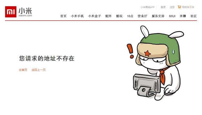 我們先來看一下在手機(jī)銷售行業(yè)一枝獨秀并憑此獲得中國2012年度經(jīng)濟(jì)人物獎的雷軍的小米。這就是小米手機(jī)官網(wǎng)的404頁面,很普通,一個圖片,一句“您請求的地址不存在”,兩個選項“去首頁”或者“返回上一頁”就完事了。與小米手機(jī)的別出心裁來比真是有點讓人失望呢!