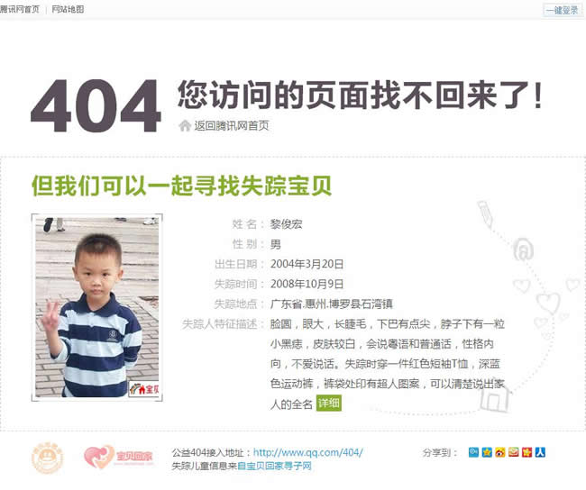 這個還是騰訊,不過除了騰訊之外,一些大型網(wǎng)站如百度等也在使用這種404頁面設(shè)計,即用戶因指令錯誤無法到達(dá)目標(biāo)頁面時,頁面直接跳轉(zhuǎn)到公益頁面,這種404頁面不能算得上創(chuàng)意(當(dāng)初這種404頁面首先被百度所運(yùn)用的時候,曾有人撰文指出百度是在抄襲國外網(wǎng)站的做法,此為外話不提),但是還是很多大型網(wǎng)站都會采用。由于這種404頁面是大型網(wǎng)站特別是靠用戶流量吃飯的網(wǎng)站來說,不但“接地氣”,體現(xiàn)了科技公司對弱勢群體的關(guān)注,而且又能使自己的404頁面不至于那么單調(diào),一舉兩得。