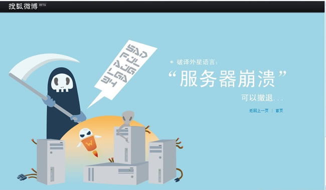 這個是搜狐微博的。可謂是意外的發(fā)現(xiàn),早上點微博的時候出現(xiàn)的。真是充滿了中國神話的色彩,一方面用死神代表服務(wù)器出現(xiàn)了問題,另外一方面用一堆看不懂的符號來表示外星語言,旁邊加上注釋“服務(wù)器崩潰,可以撤退……”碰上這兩個家伙,真是應(yīng)當(dāng)馬上撤退呀!