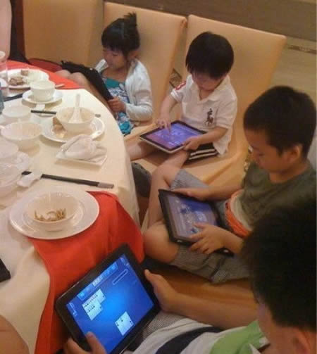 iPad。這一張,被認為是現(xiàn)在兒童生活的寫照。幾個兒童碰面,不是一起玩,而是各種抱著自己的iPad跟網(wǎng)絡虛擬世界交流著。它們懂與虛擬對手斗地主,進入游戲室玩游戲,各種dota,lol,甚至還會聊微信,刷微博,但是他們與現(xiàn)實世界中的同伴是分離開來的,除了上課和吃飯睡覺之外,他們就抱著Ipad和iPhone手機沉浸于自己的世界之中。因而會越長越孤單。